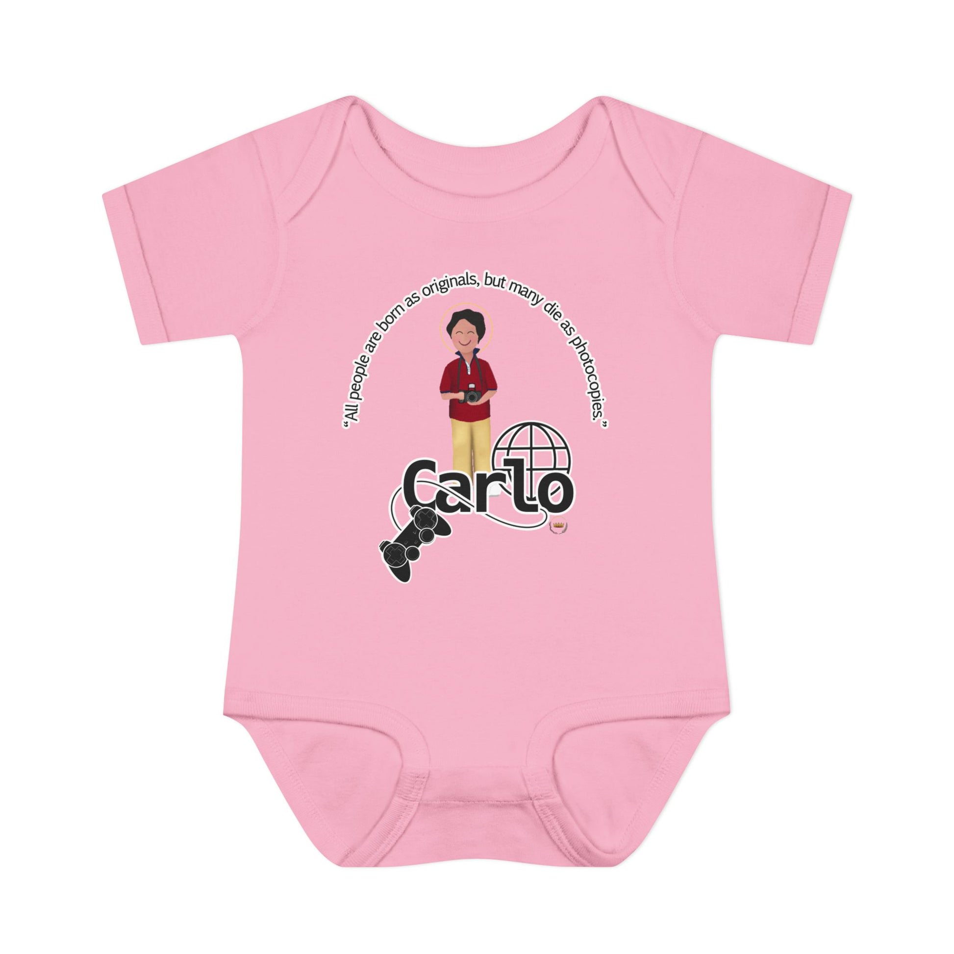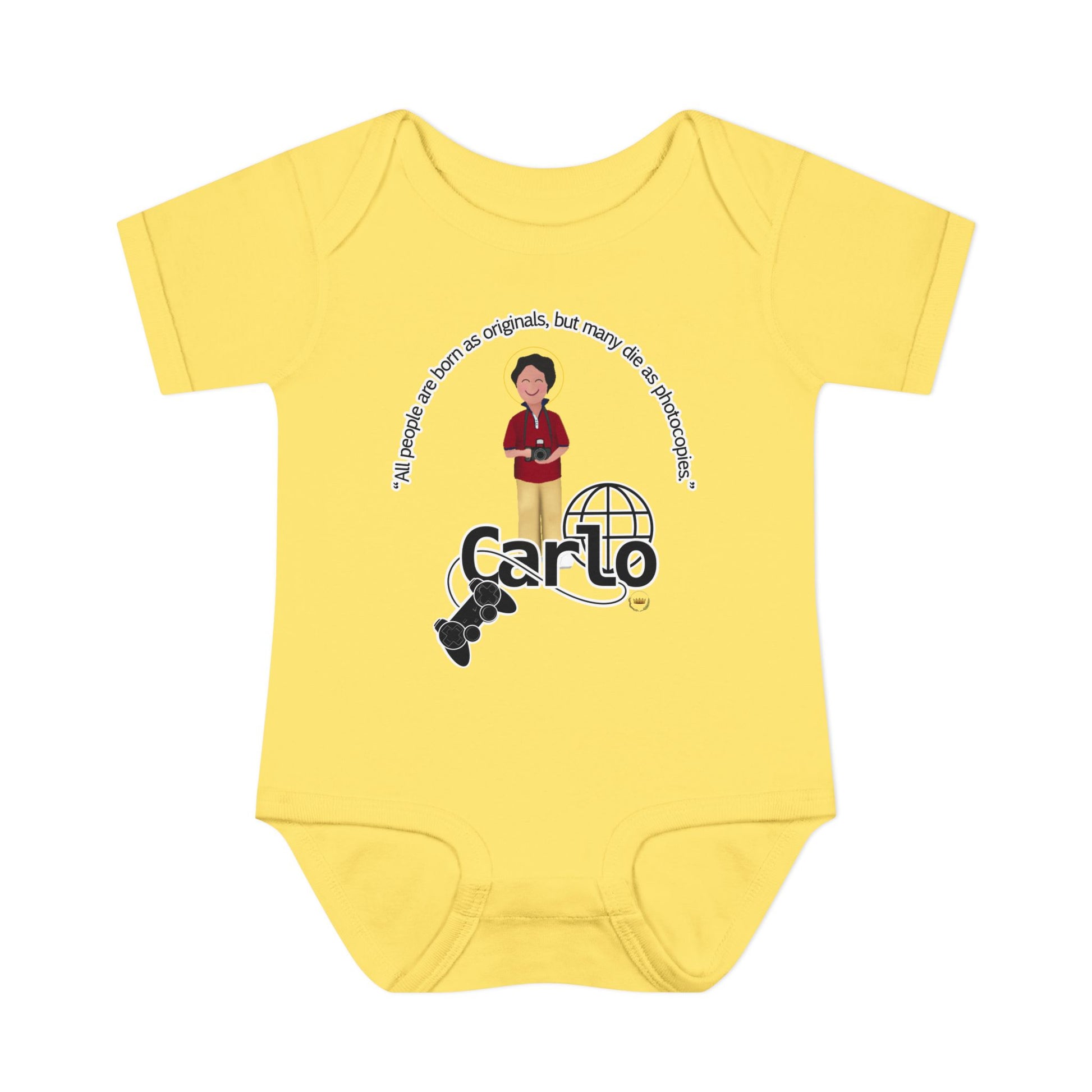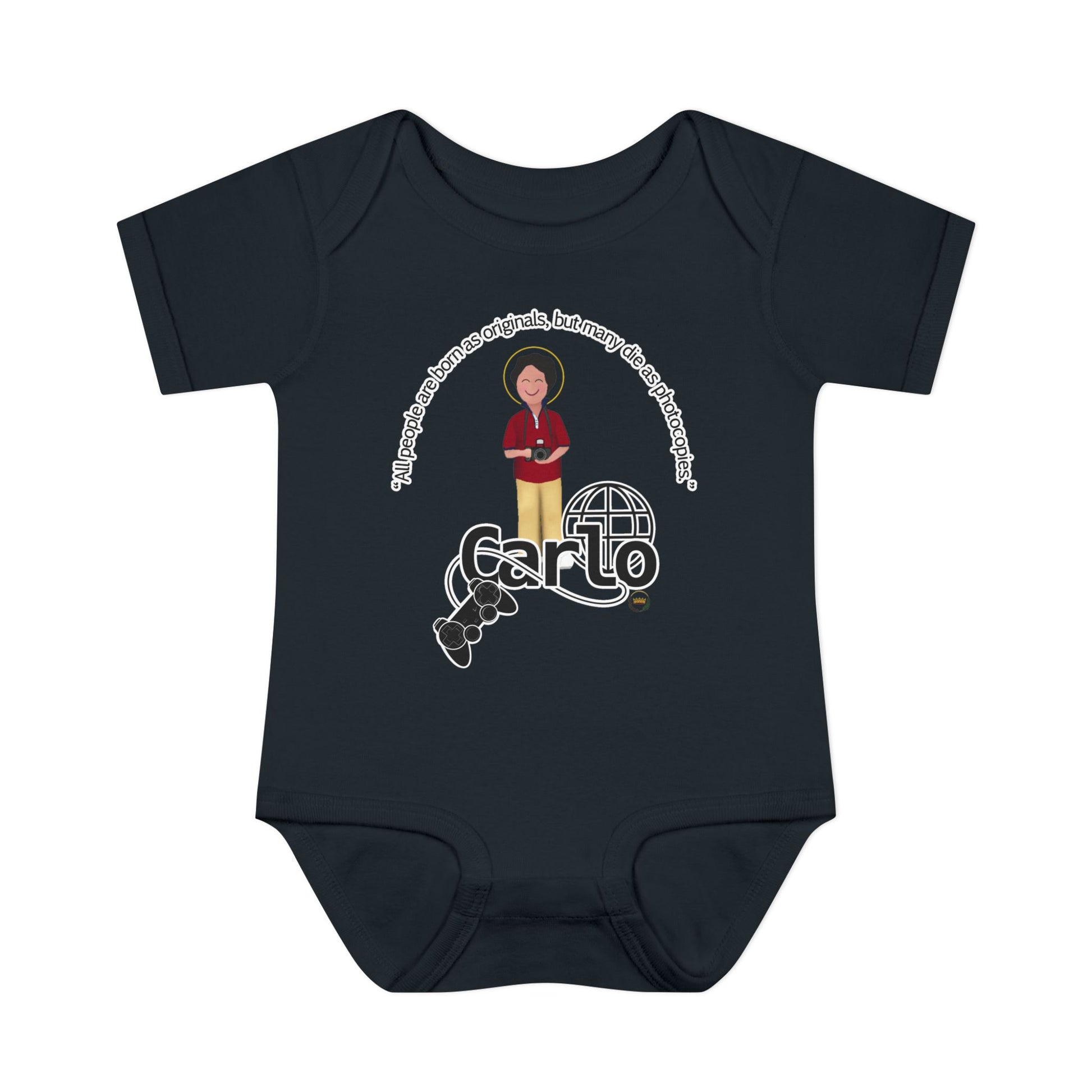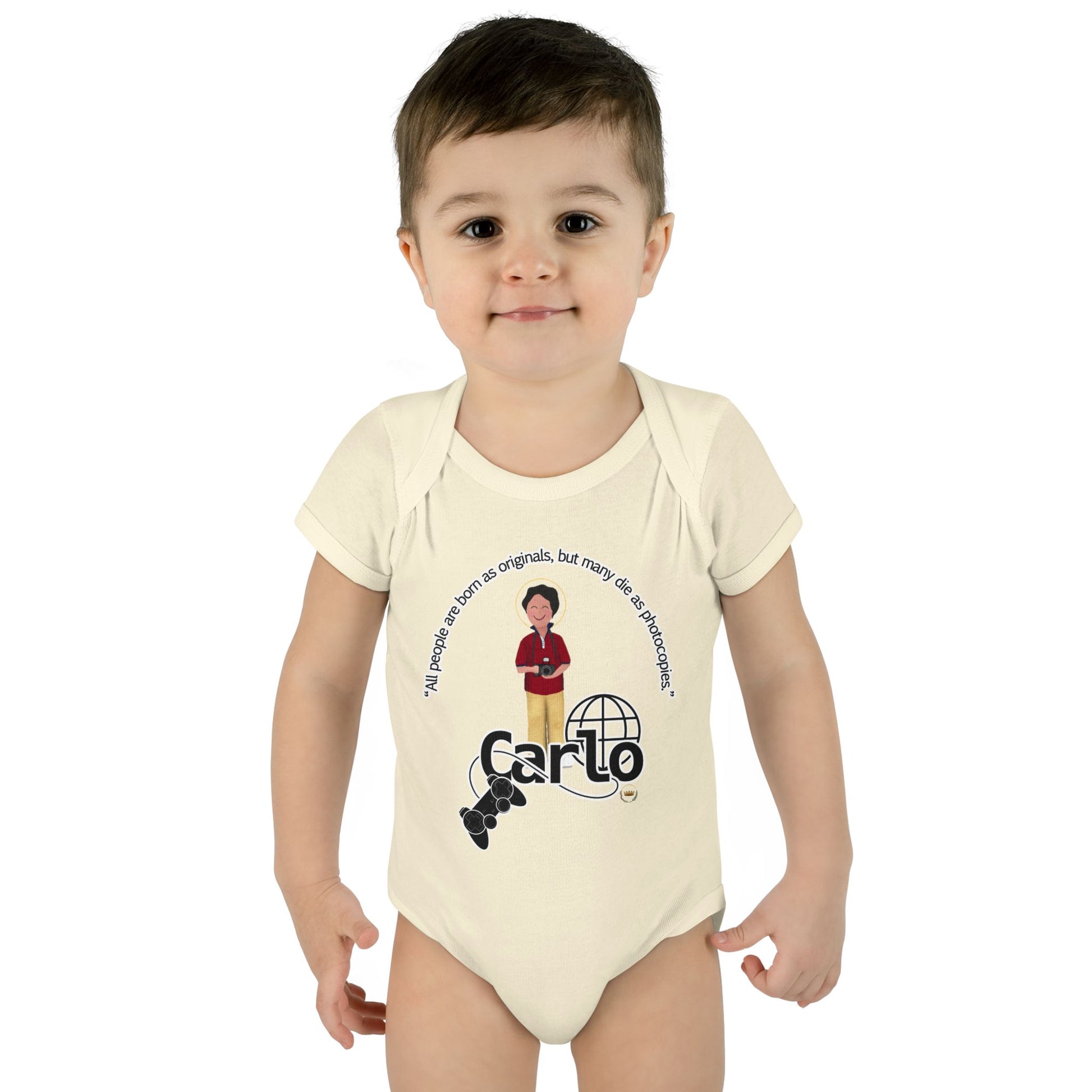 Wrap your little one in comfort and inspiration with this Blessed Carlo Acutis onesie. Featuring a playful illustration of Carlo and his famous words—“All people are born as originals, but many die as photocopies”—this piece of baby apparel is both adorable and meaningful. It’s never too early to share a message of faith and authenticity.