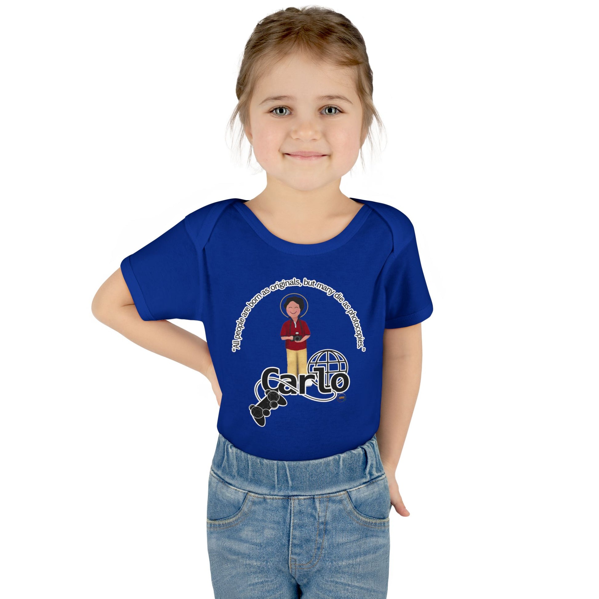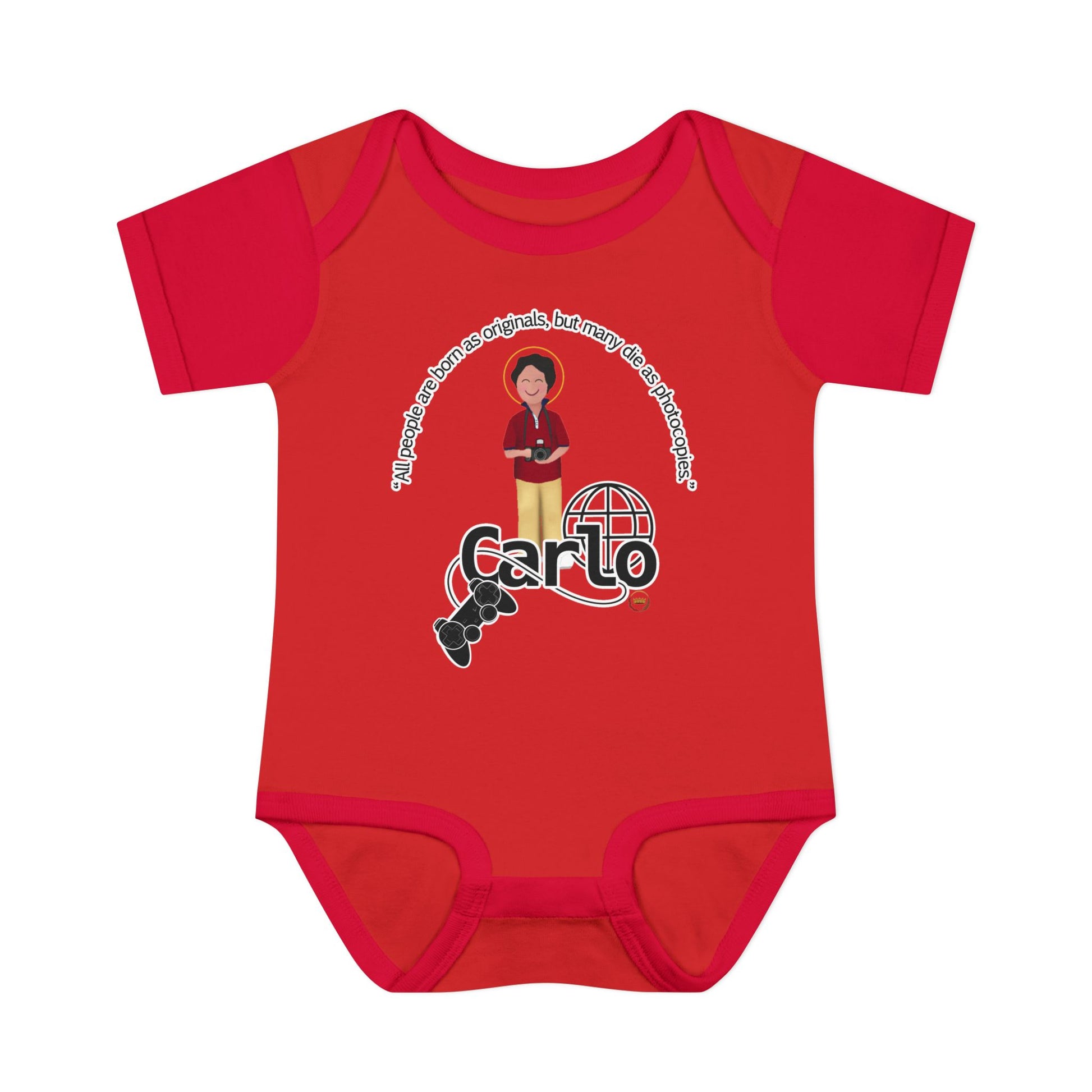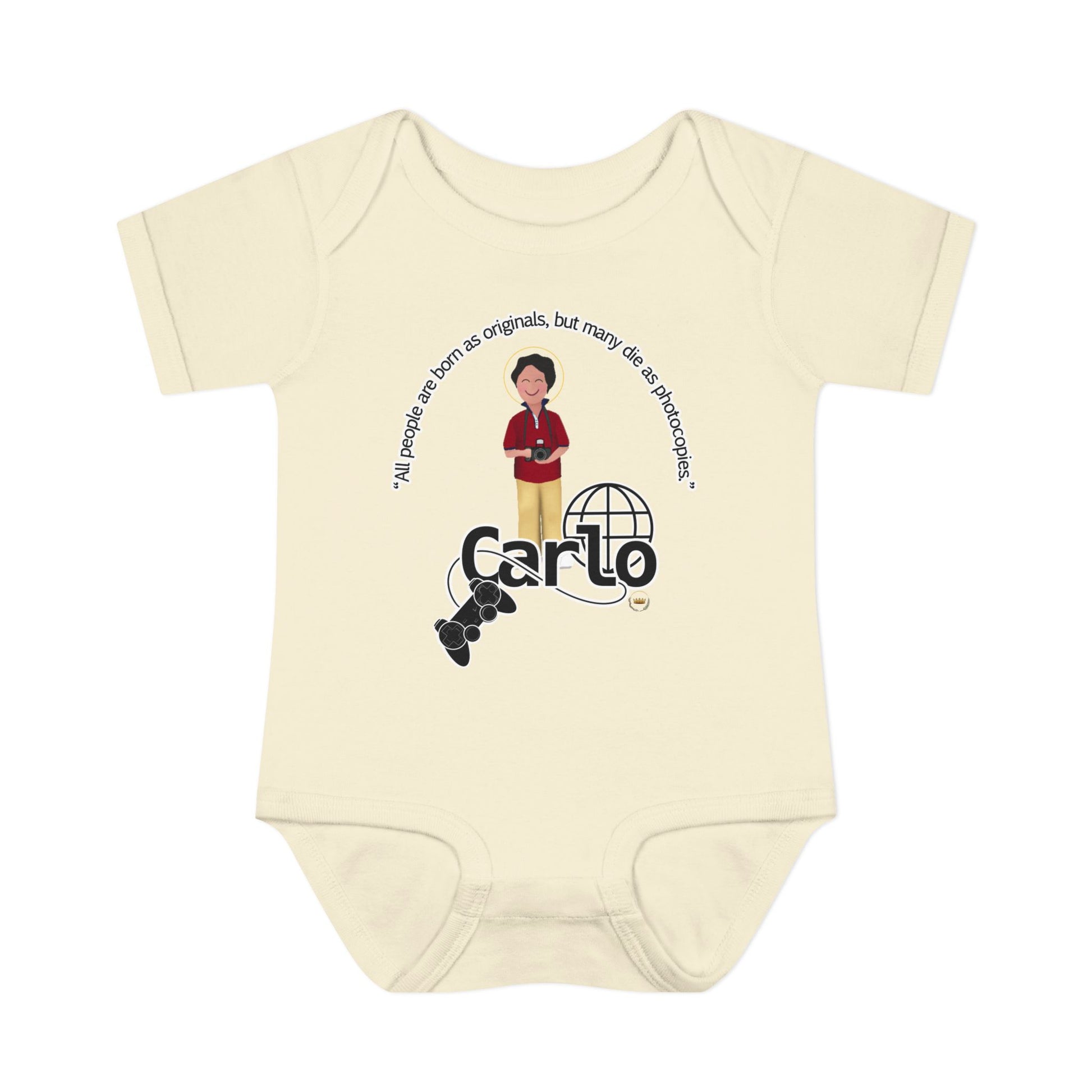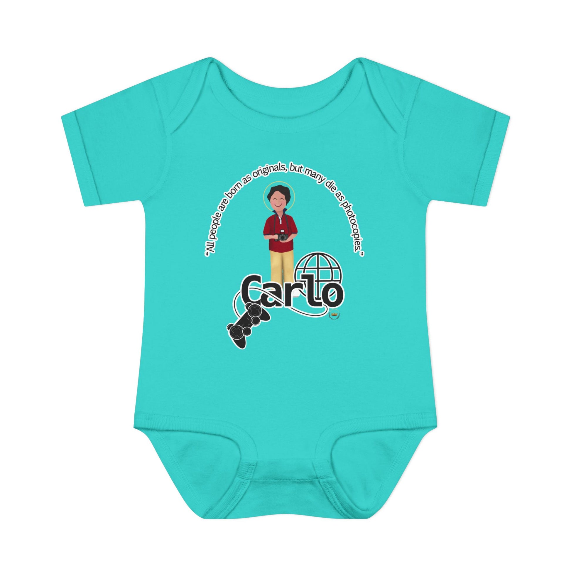 Wrap your little one in comfort and inspiration with this Blessed Carlo Acutis onesie. Featuring a playful illustration of Carlo and his famous words—“All people are born as originals, but many die as photocopies”—this piece of baby apparel is both adorable and meaningful. It’s never too early to share a message of faith and authenticity.