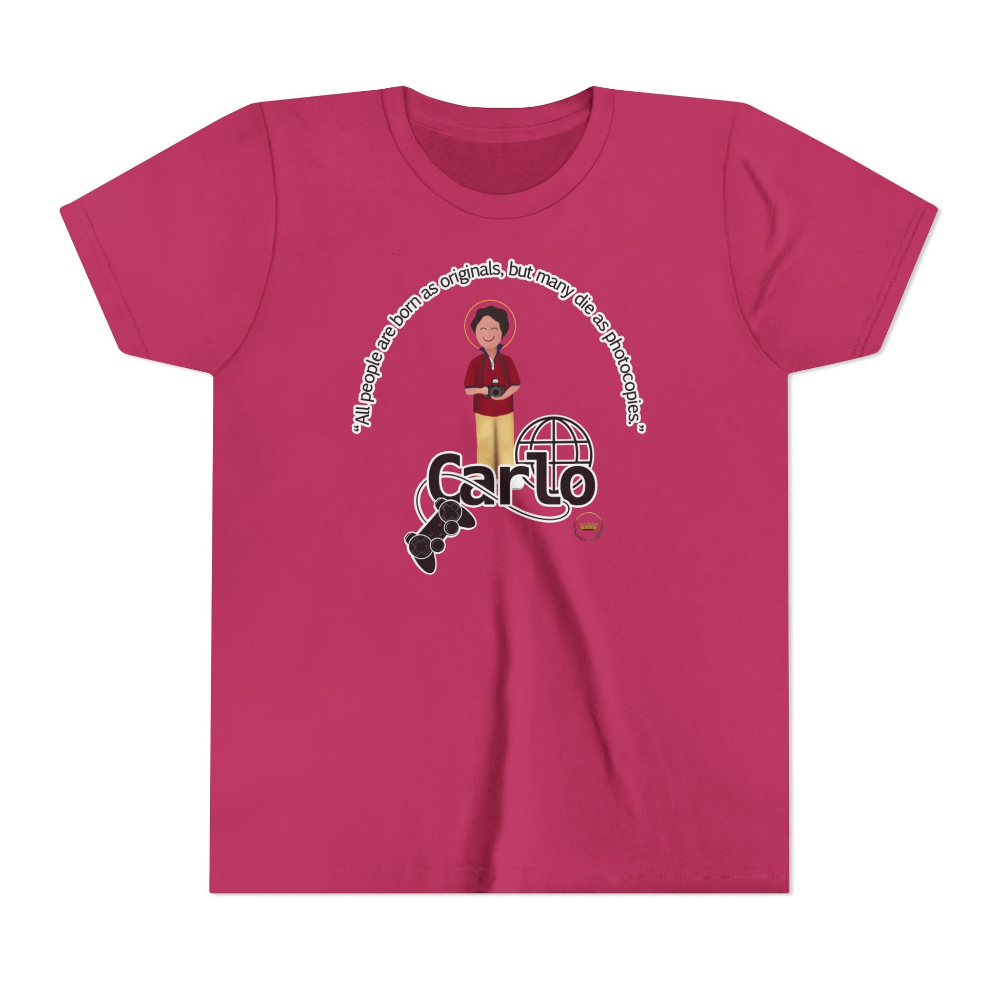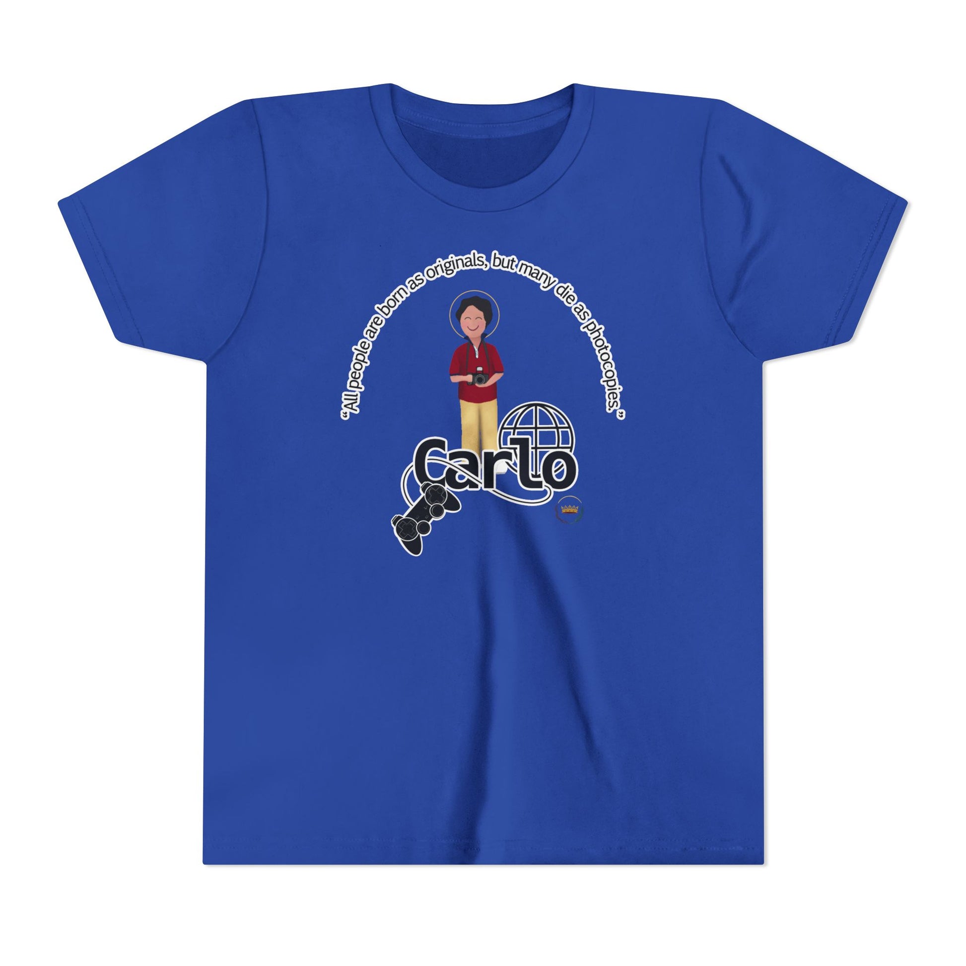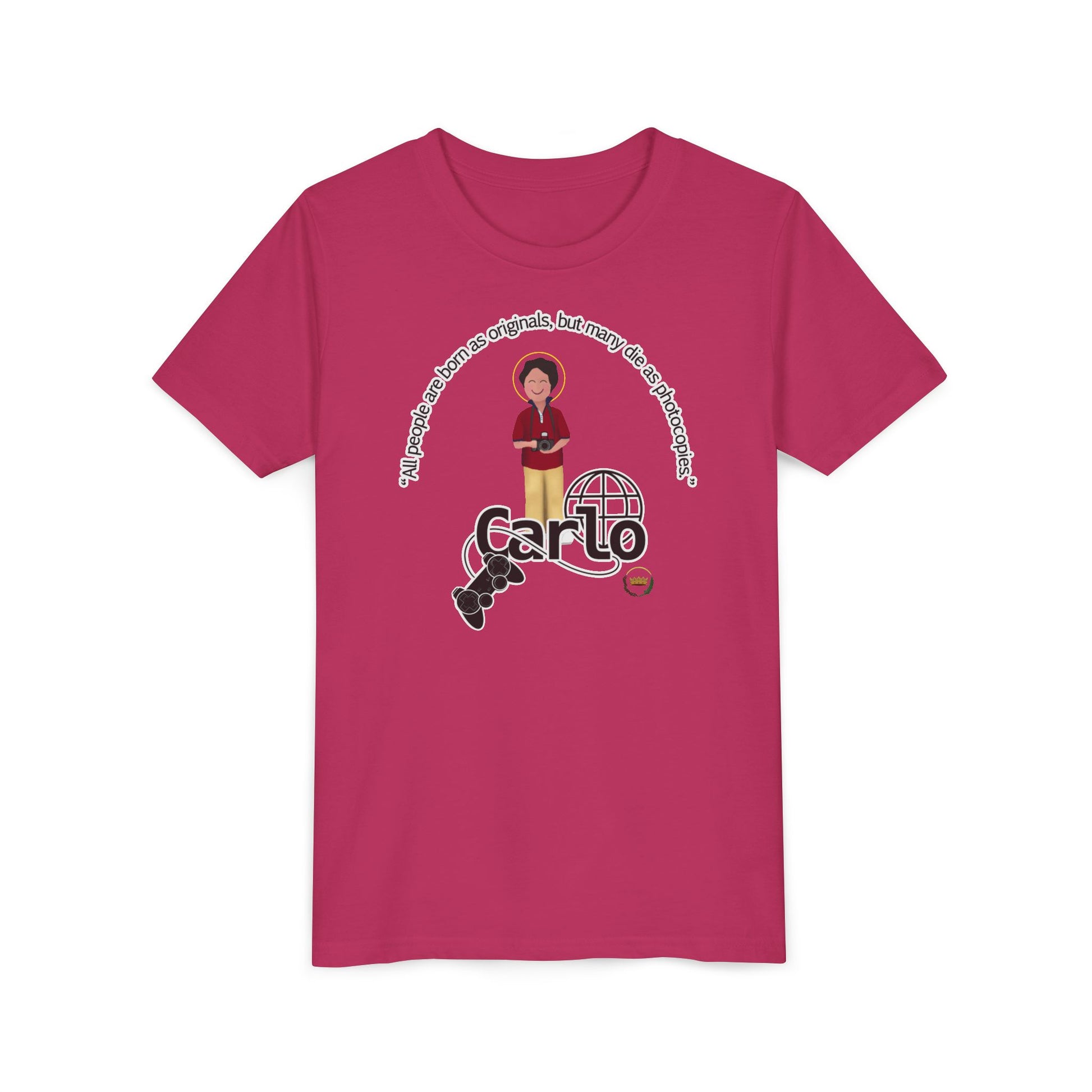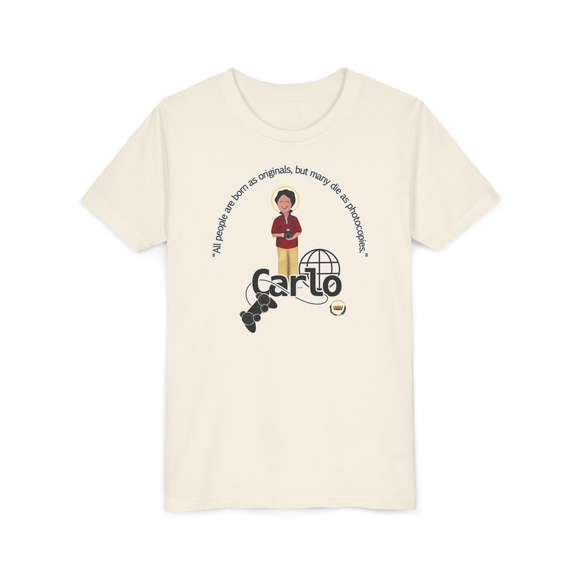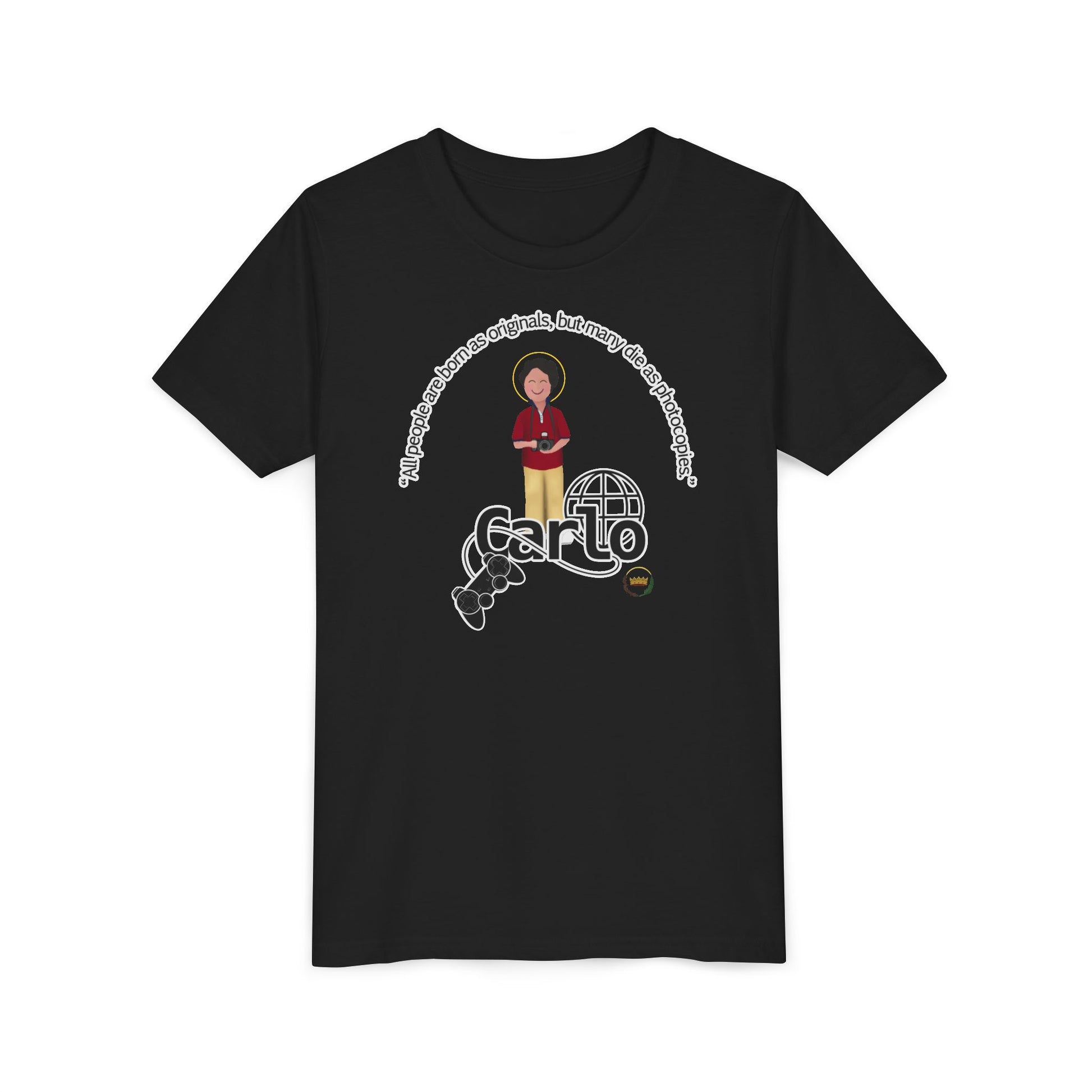 Inspire the next generation of saints with this St. Carlo Acutis Youth T-Shirt. Featuring a cheerful illustration of Blessed Carlo along with his famous quote, “All people are born as originals, but many die as photocopies,” this shirt is a daily reminder to live boldly and authentically in Christ.