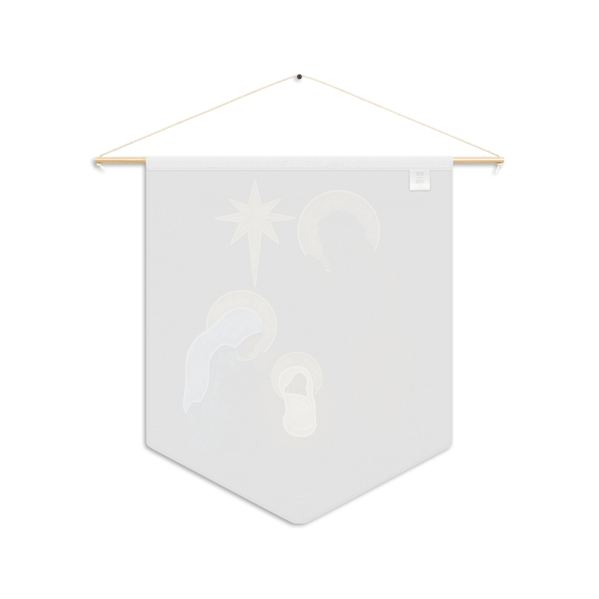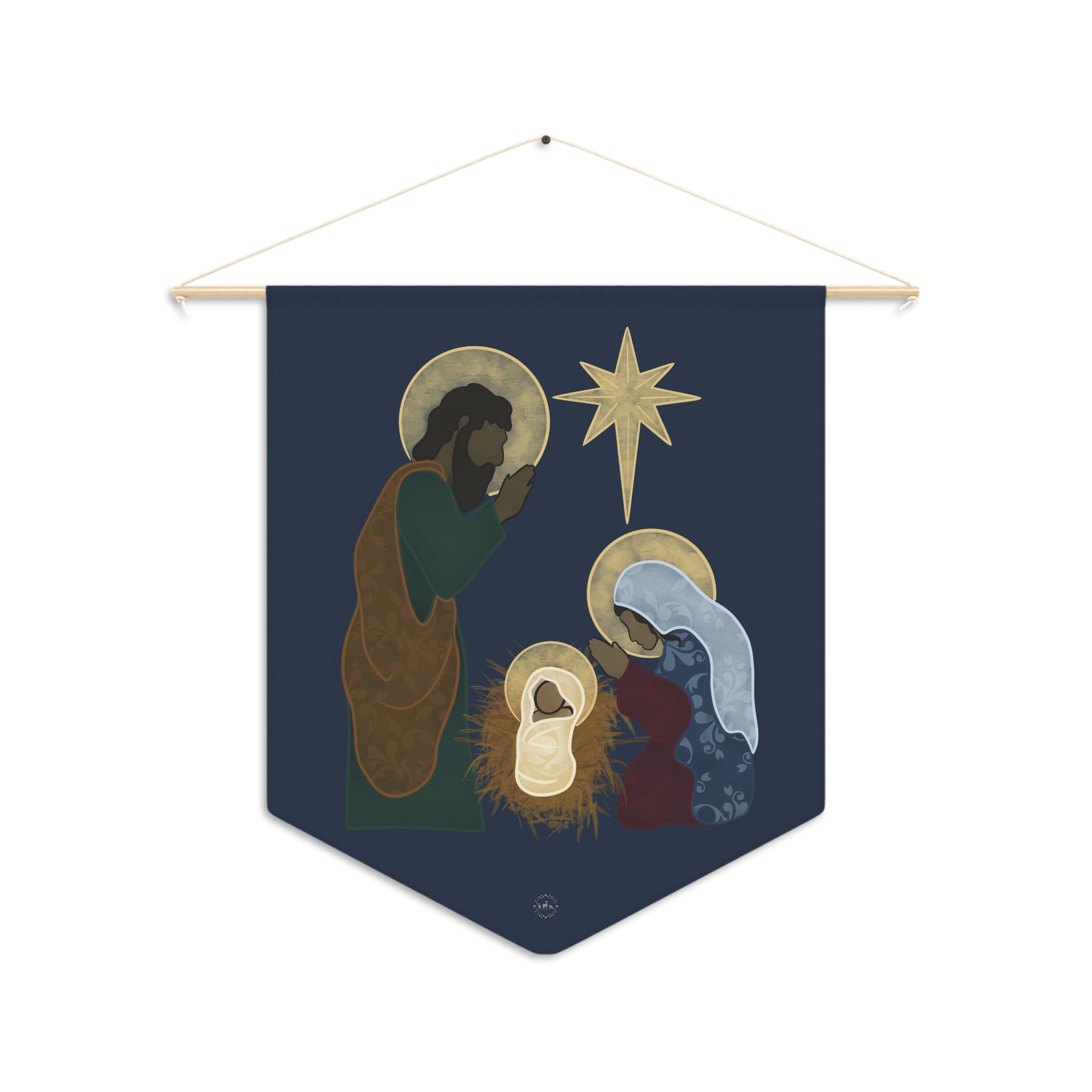 Celebrate the wonder of Christmas with this beautifully crafted Nativity Wall Hanging Pennant, featuring a serene illustration of the Holy Family beneath the Star of Bethlehem.