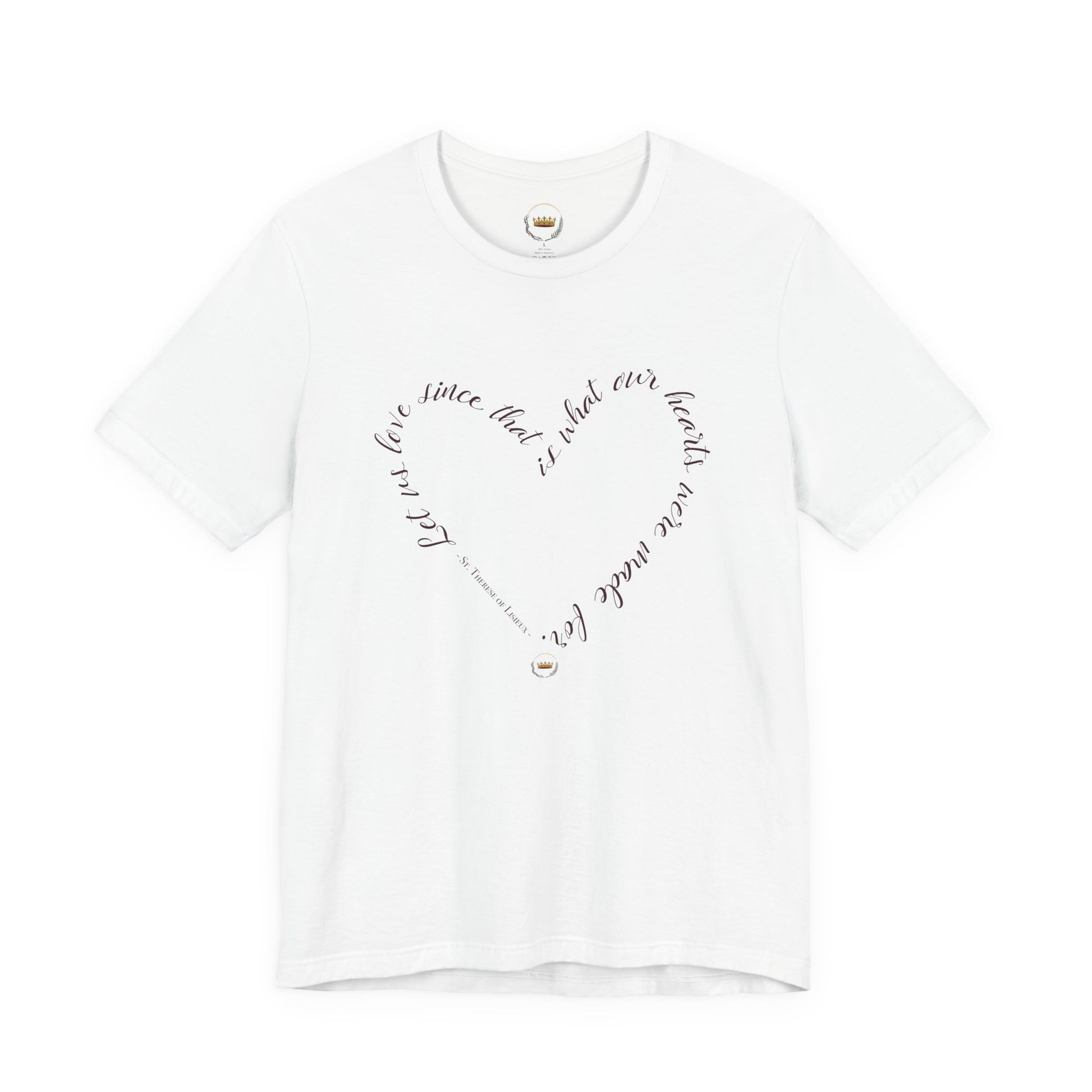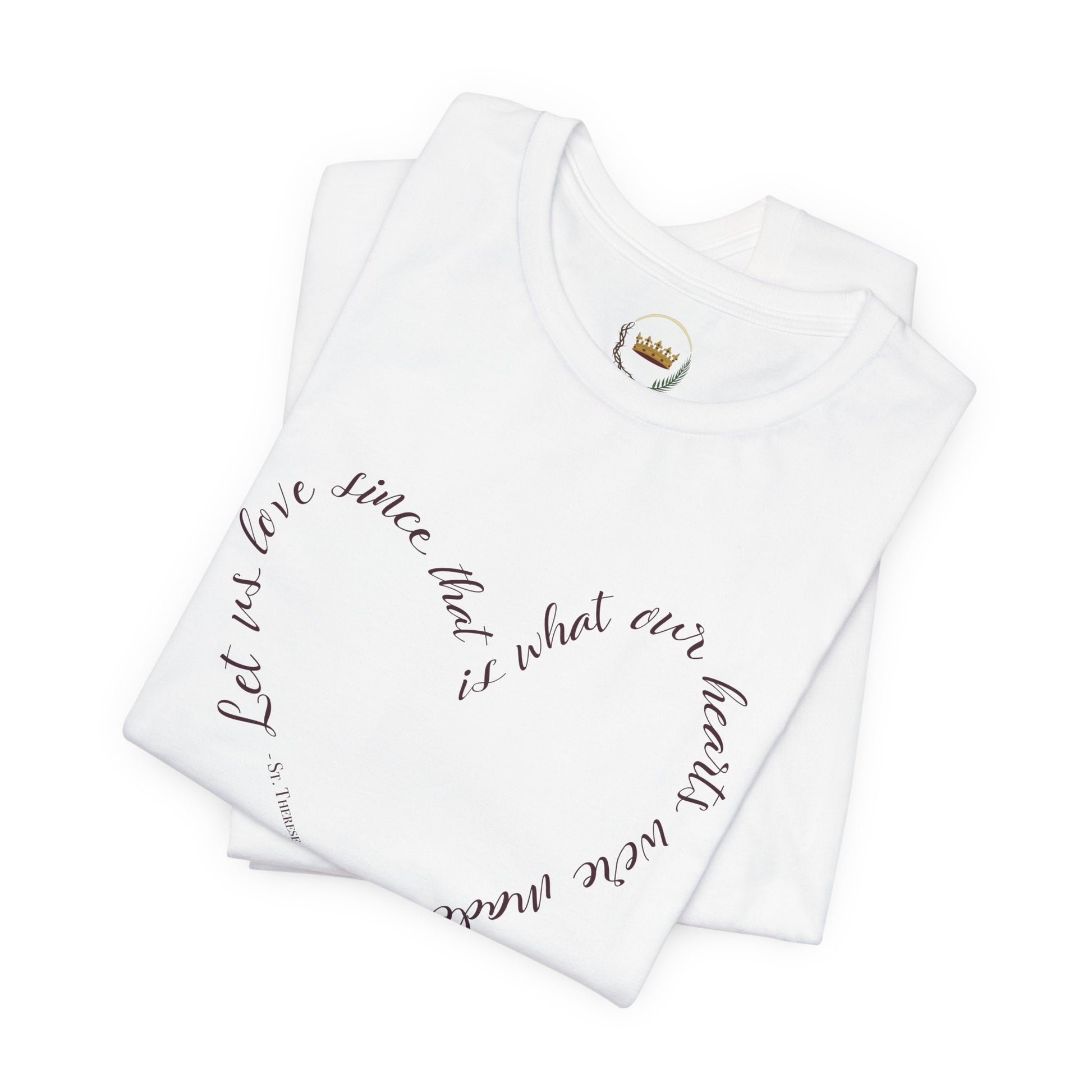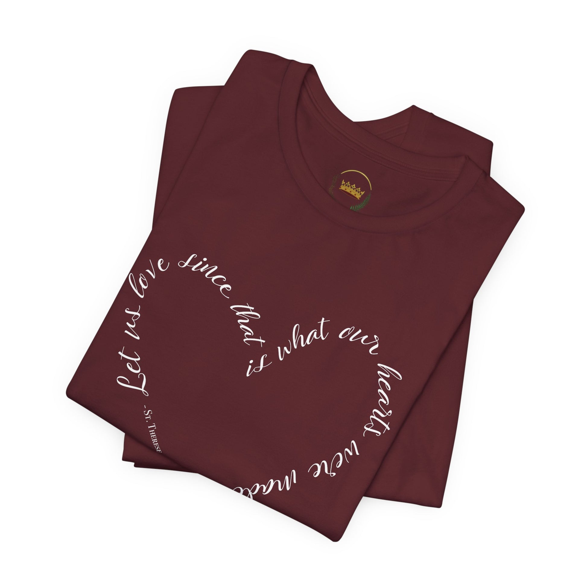 Carry a message of love and faith wherever you go with this “Let Us Love” T-Shirt. Featuring the quote from St. Thérèse of Lisieux: “Let us love, since that is what our hearts were made for.” arranged in the shape of a heart, this shirt beautifully blends style with inspiration.