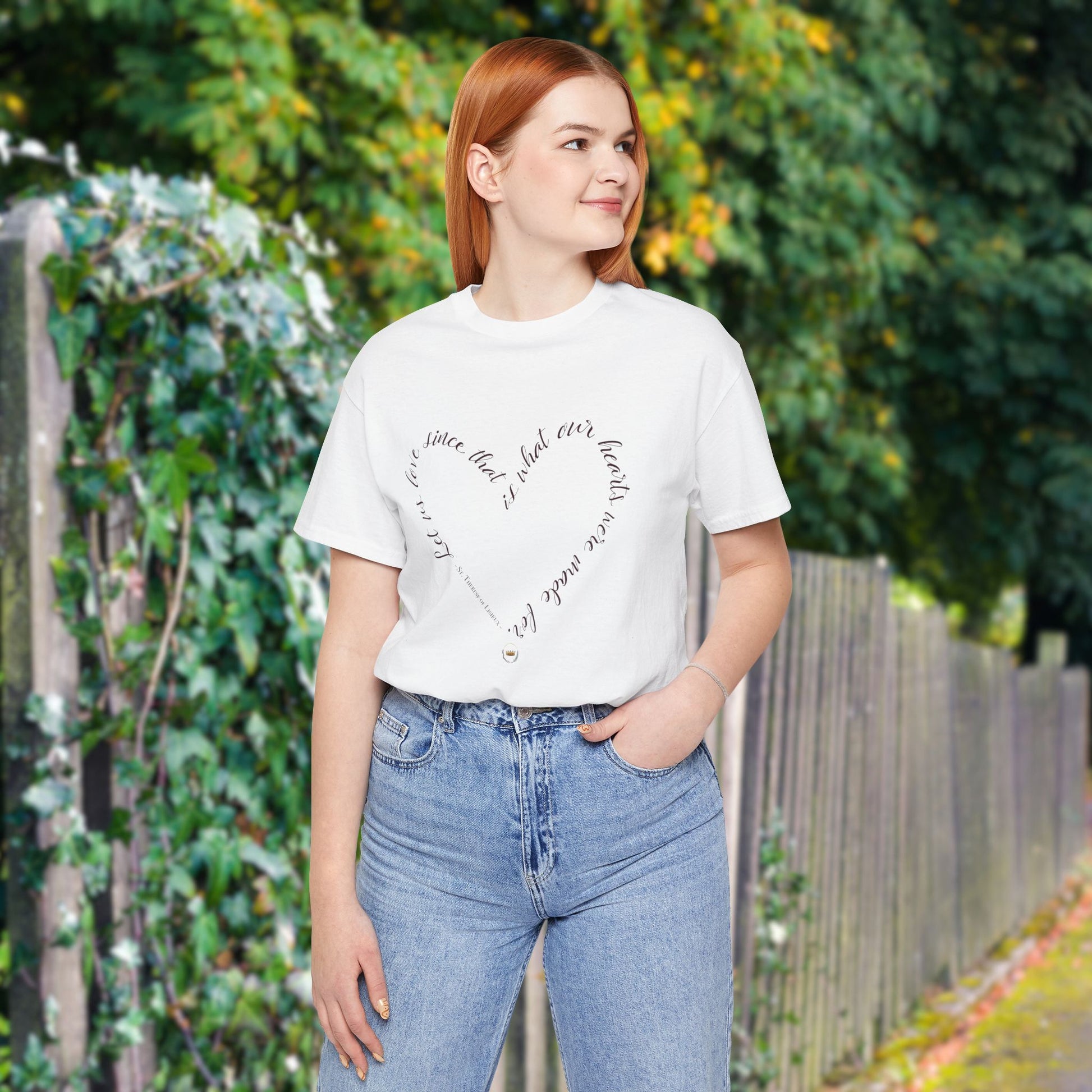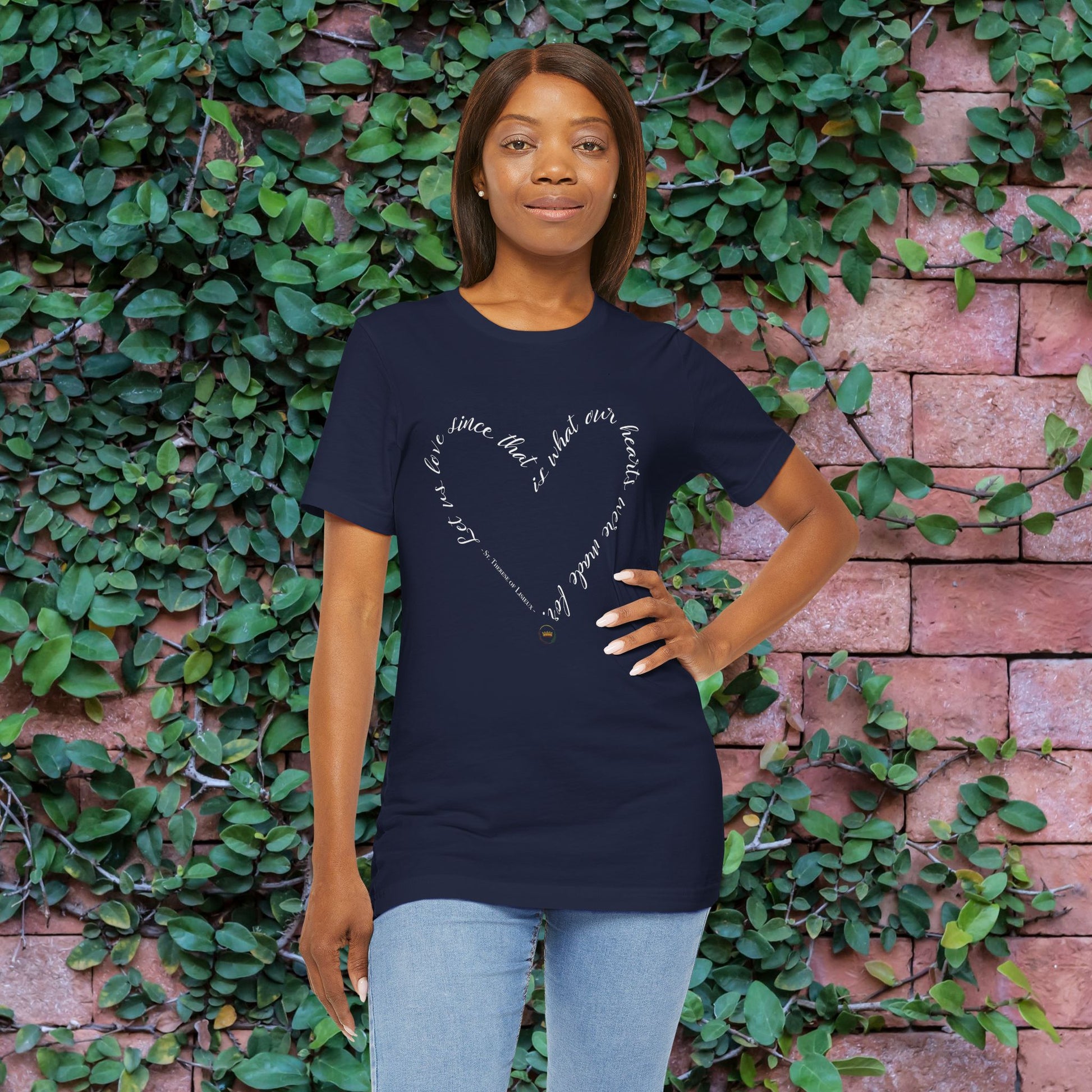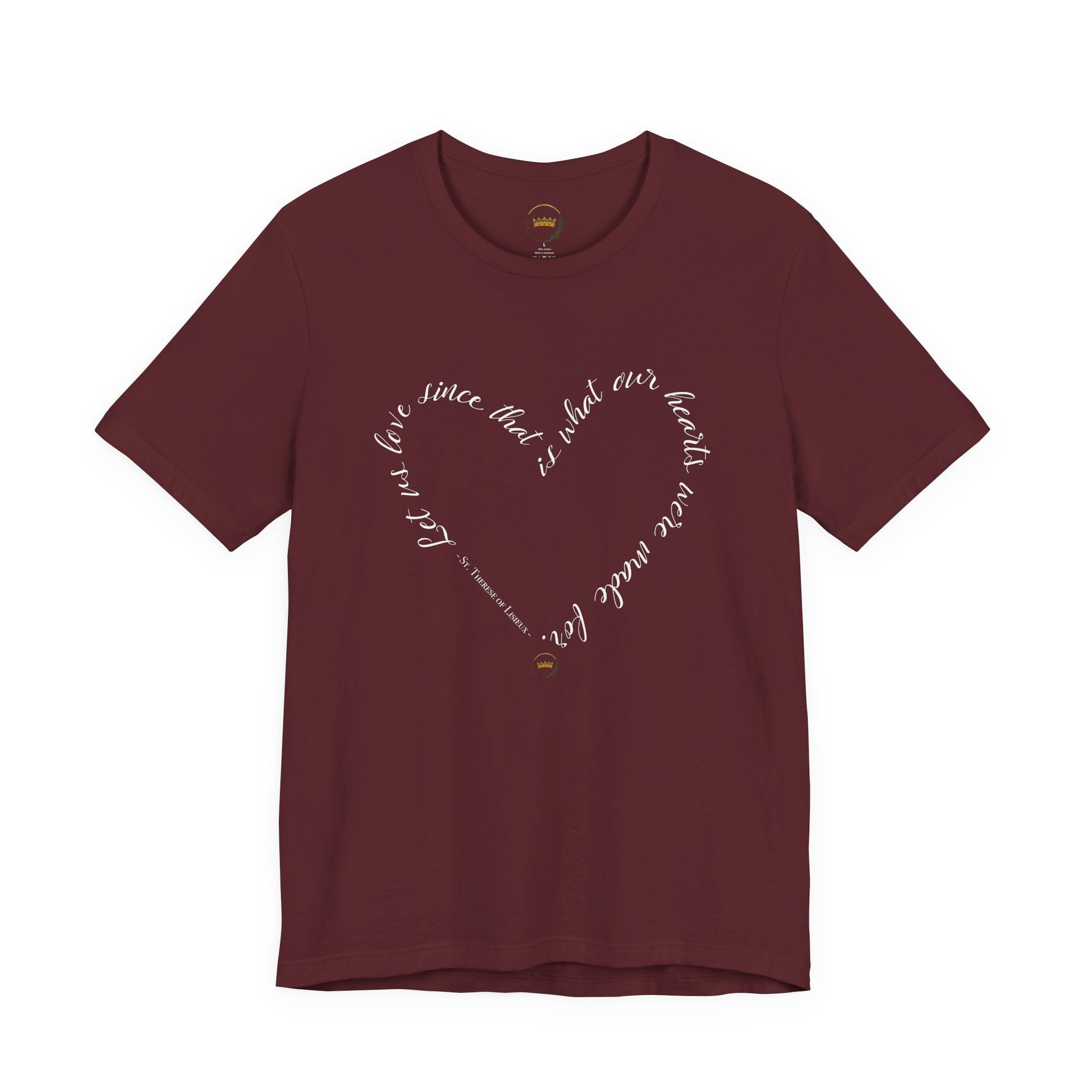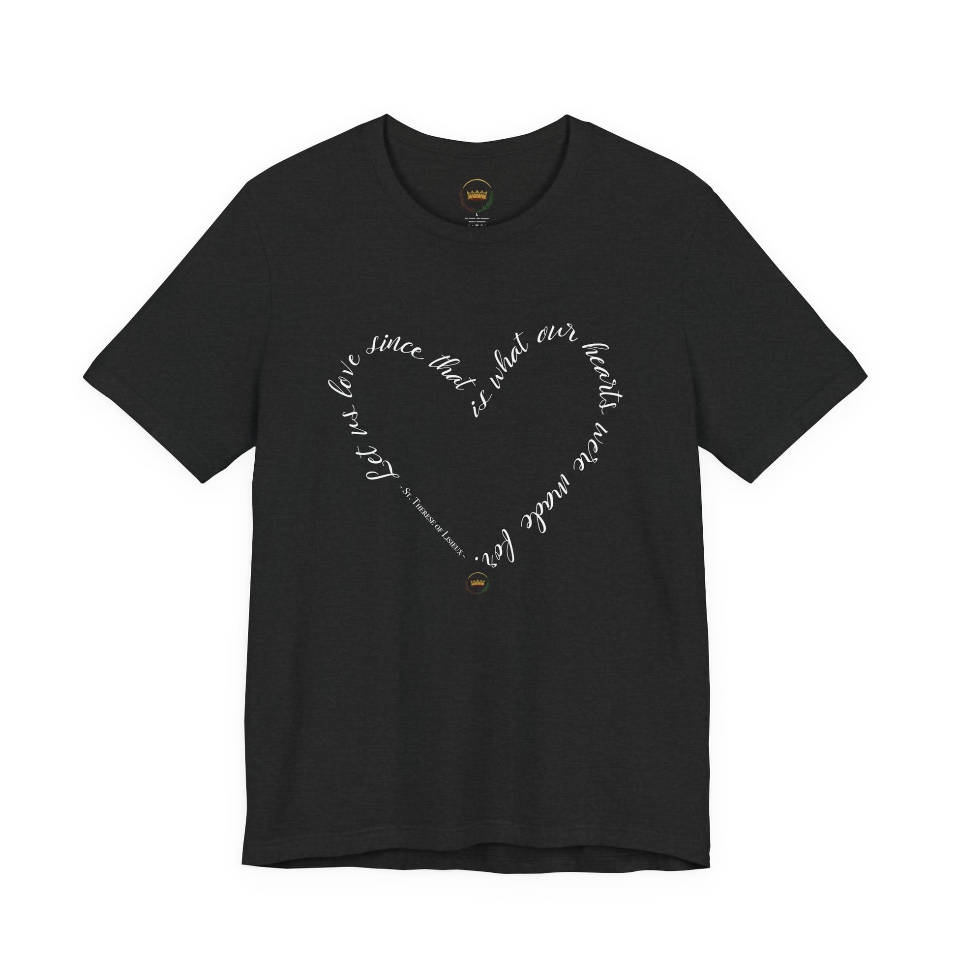 Carry a message of love and faith wherever you go with this “Let Us Love” T-Shirt. Featuring the quote from St. Thérèse of Lisieux: “Let us love, since that is what our hearts were made for.” arranged in the shape of a heart, this shirt beautifully blends style with inspiration.
