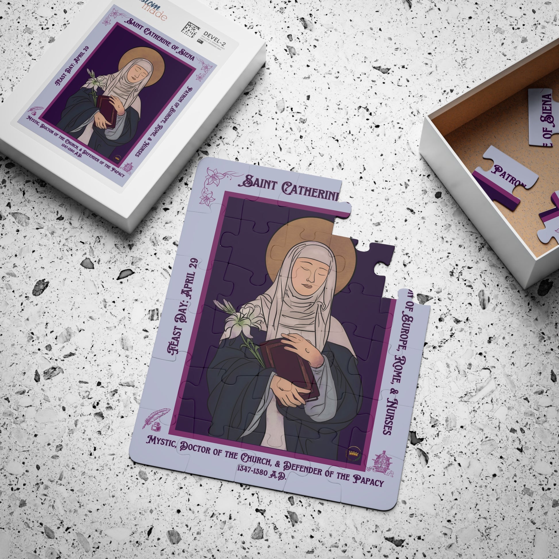 Bring the faith to playtime with this delightful St. Catherine of Siena 30-piece puzzle, designed especially for children! Featuring a colorful illustration of the bold mystic and Doctor of the Church, this puzzle is both fun and formative.