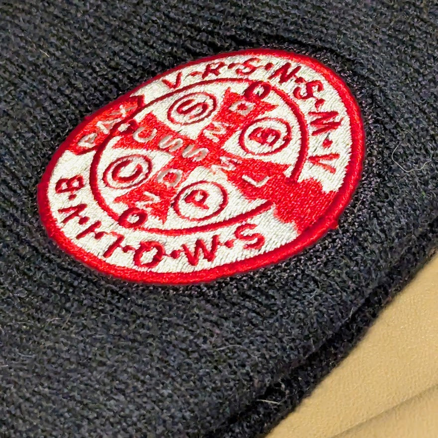 Benedict Medal beanie, Catholic beanie, Traditional Catholic gift, Benedictine school apparel, Belmont Abbey gift, Benedictine College style, faith beanie, embroidered Catholic accessory, Saintology.