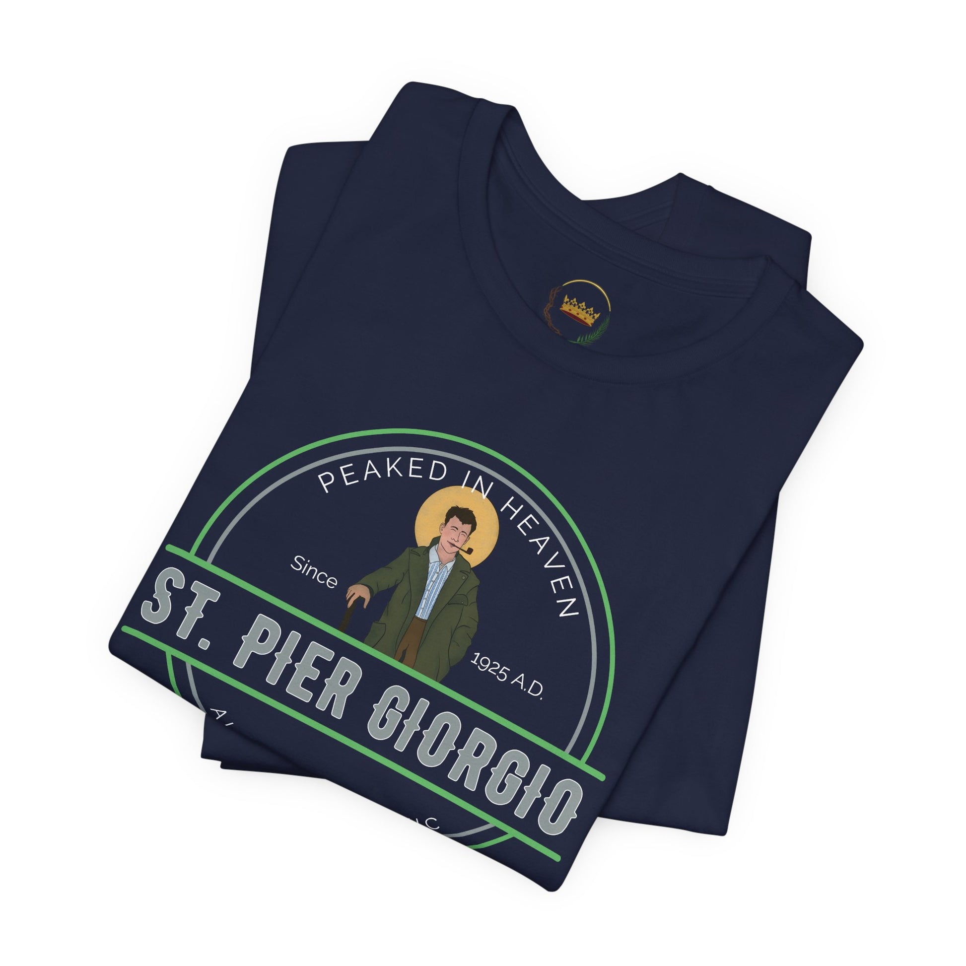 This shirt features a vintage barrel logo design with the phrase “Peaked in Heaven” and highlights Pier Giorgio’s legacy as a mountaineer and servant of Christ. Whether you wear it for casual outings, youth ministry events, or outdoor adventures, this shirt is both a faith-filled witness and a comfortable everyday staple.