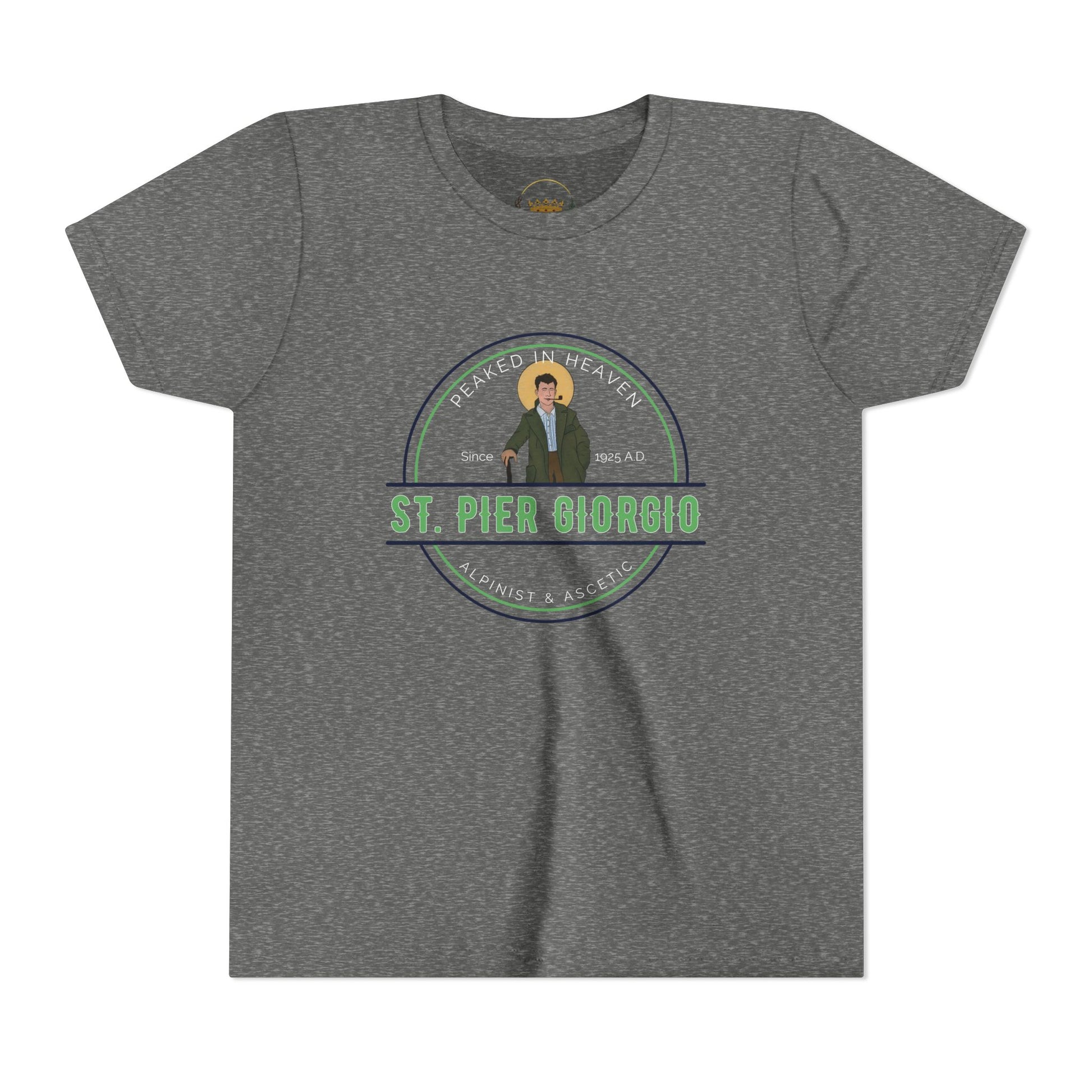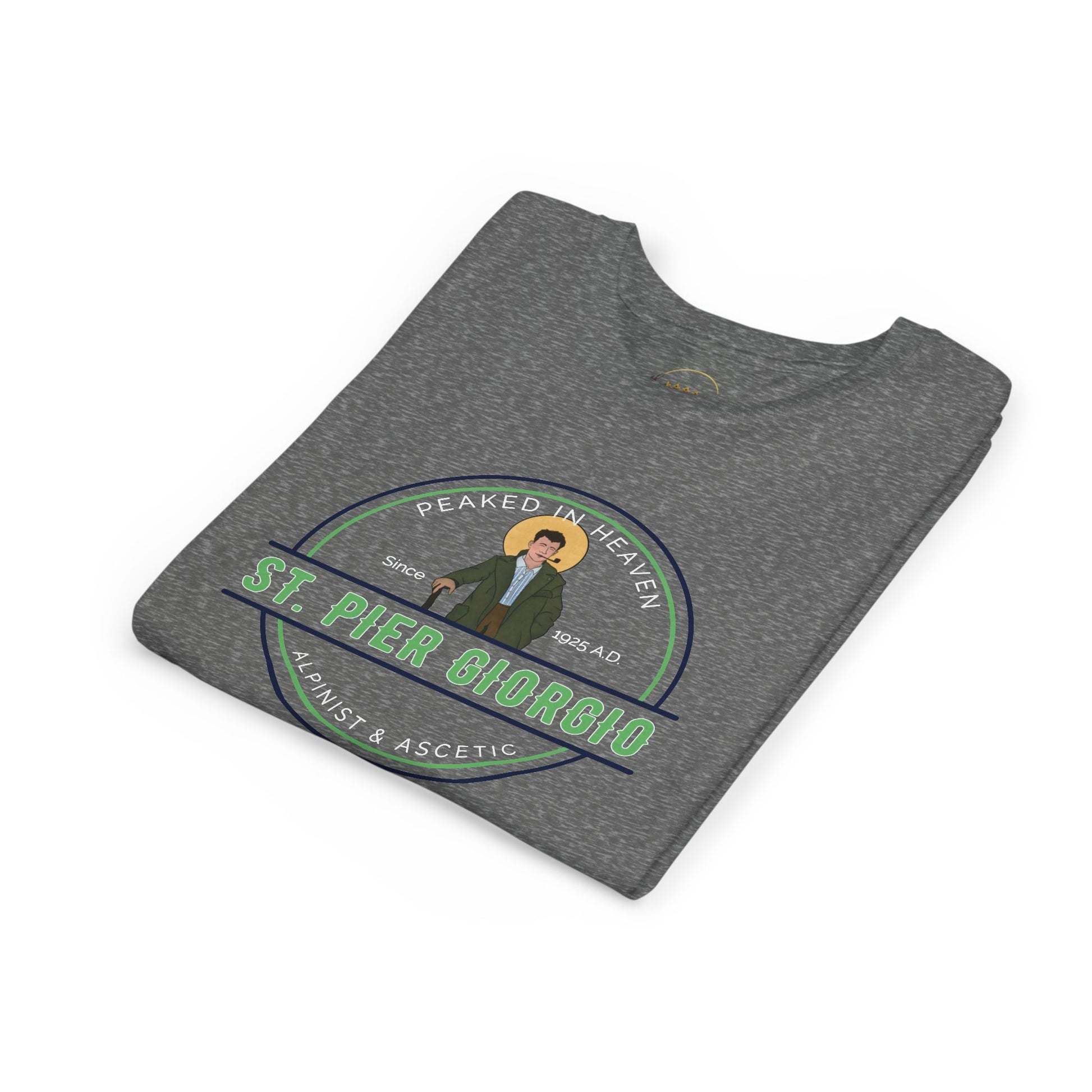 Celebrate the adventurous spirit of St. Pier Giorgio Frassati, patron of young people, students, and mountaineers. This youth t-shirt features a bold barrel-branding style design with Frassati’s image at the center and the words “Peaked in Heaven – Since 1925 A.D.” encircling it—a nod to his love of climbing mountains and striving for holiness.