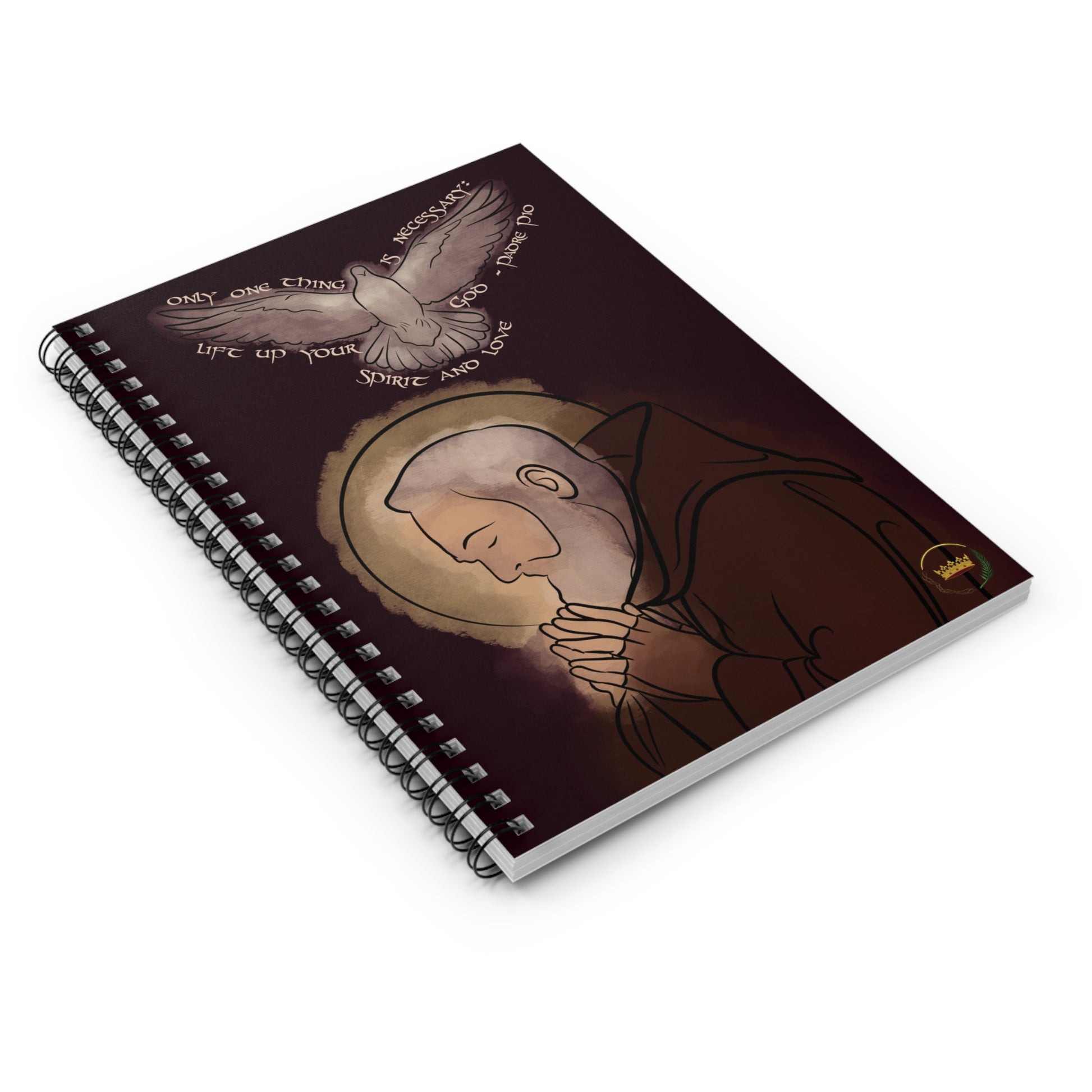 Keep your thoughts, prayers, and reflections close to heart with this beautifully designed Padre Pio spiral-bound journal. Featuring an inspiring illustration of Padre Pio in prayer, a radiant halo, and the Holy Spirit above, it reminds you of his powerful words: “Only one thing is necessary: lift up your spirit and love God.”